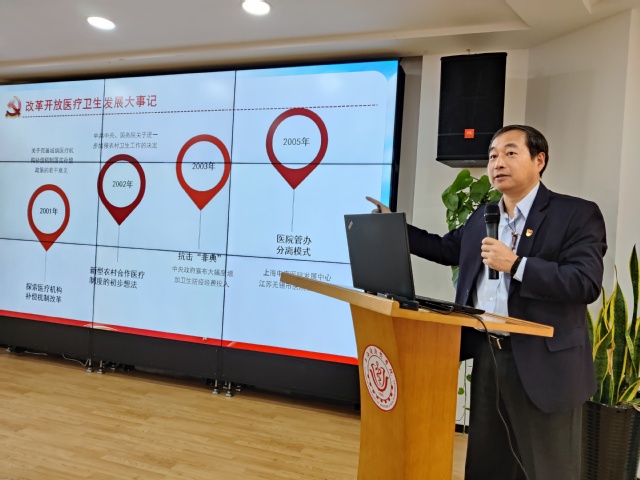 党课从前言、改革开放医疗卫生发展大事记、医疗卫生改革的思路、医疗卫生改革成就、健康中国背景下的j9九游(官方)网站等五个内容开展。沈国芳副校长从2019年我国卫生健康事业发展统计公报的数据讲起,结合我国医疗卫生发展的大事记,从具体的事件深入浅出地介绍了我国医疗改革的总体状况。从过去到现在,从缺失、不完善到趋于完善,沈国芳的讲话层层递进、为全体教师展示了我国医疗卫生事业的变迁过程。讲到健康中国战略的发展时,他强调了习近平总书记就健康中国建设发表的一系列重要论述的意义,回顾了2012年8月党中央提出“健康中国2020”战略研究报告,再到2019年6月关于实施健康中国行动的意见等一系列健康中国战略的发展历程。对于“健康中国2030”规划,沈国芳详解读,联系学校发展实际,他认为全体教师要投身健康中国事业,发挥主观能动性,做到人人参与、人人尽力、人人享有。结合师生齐参与的“医之魂——医学人文油画及雕塑展”、“悦读润道品牌活动”以及“传承红医精神”等特色建设项目为例,沈国芳对当前开展健康人文项目予以了充分肯定。